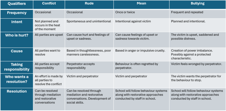 The school works hard to ensure that all students know the difference between bullying and simply “falling out”. Friendship fallouts occur at times and occasionally there will be conflict between students. Bullying occurs where there is an imbalance of power that is persistent and deliberate.